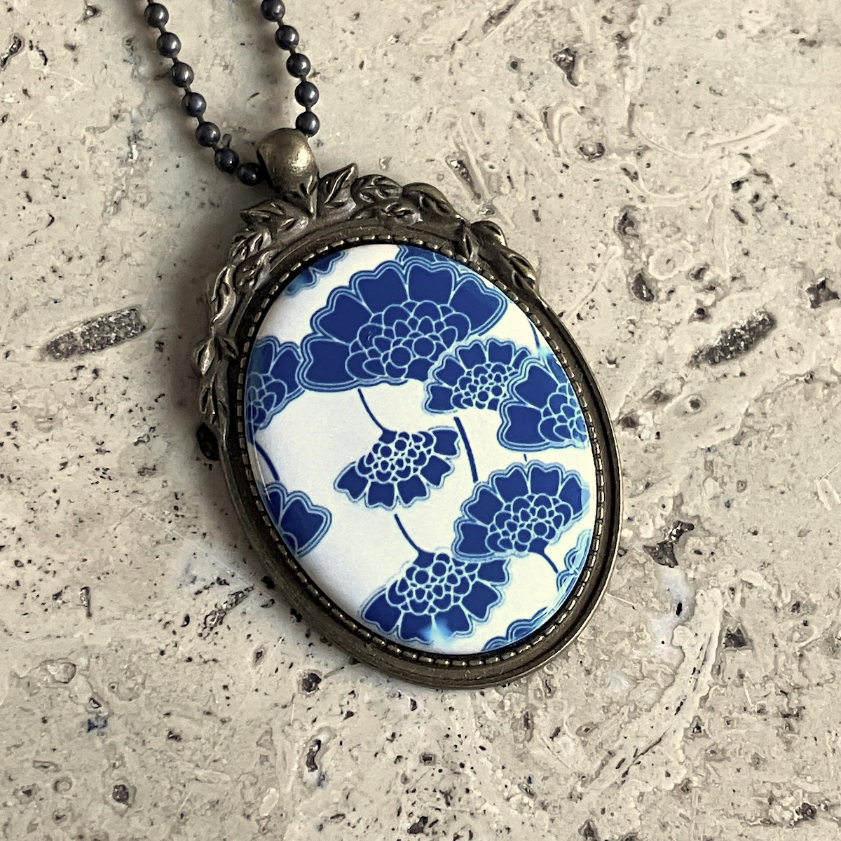 Bijou en métal orné d’un camée de 4 x 3 cm, imprimé artisanalement par mes soins.