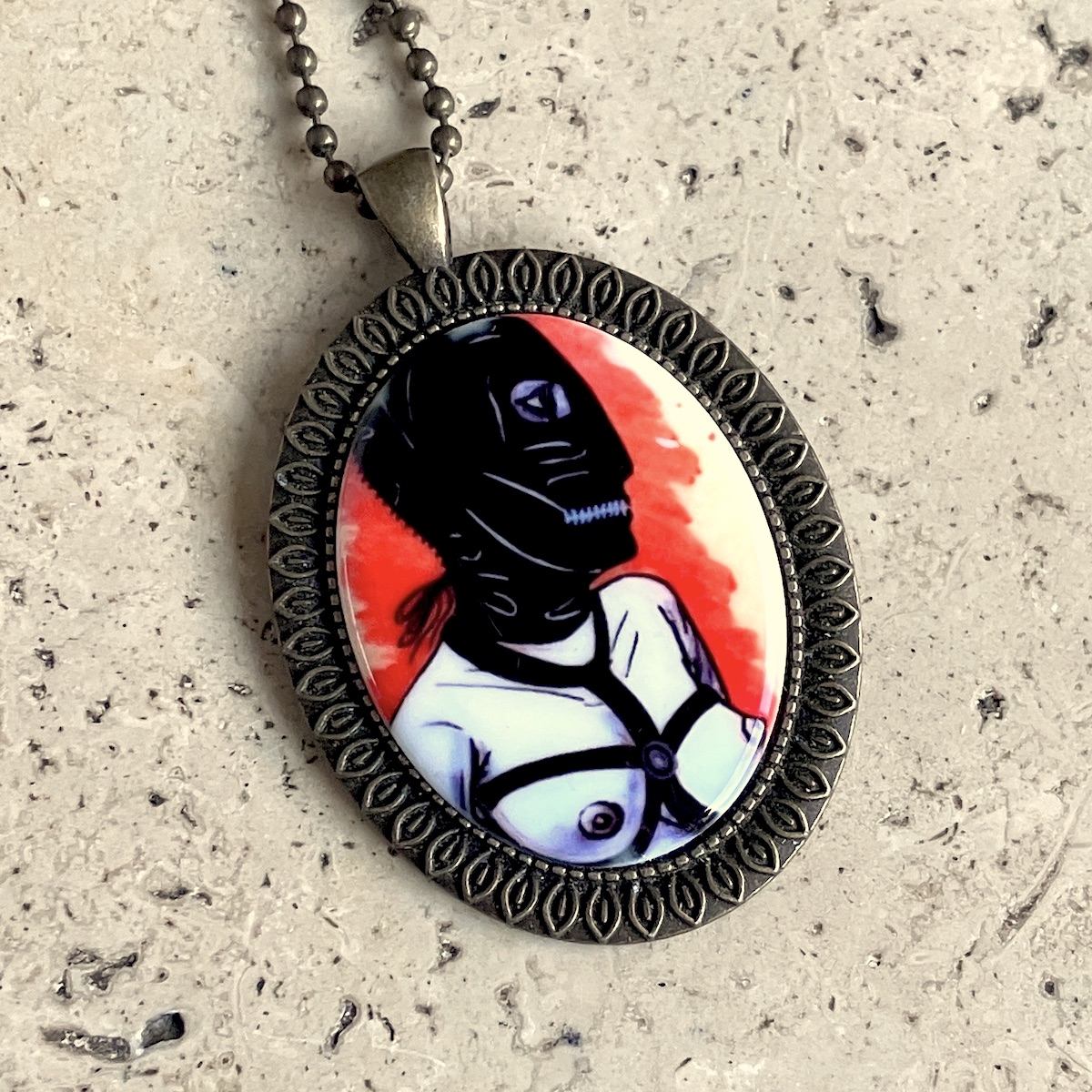 Bijou en métal orné d’un camée de 4 x 3 cm, imprimé artisanalement par mes soins.