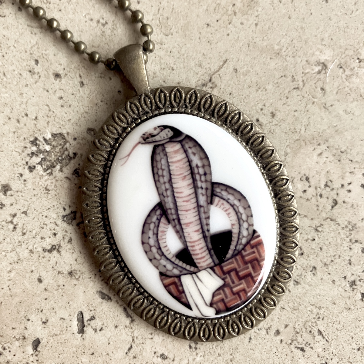 Bijou en métal orné d’un camée de 4 x 3 cm, imprimé artisanalement par mes soins.