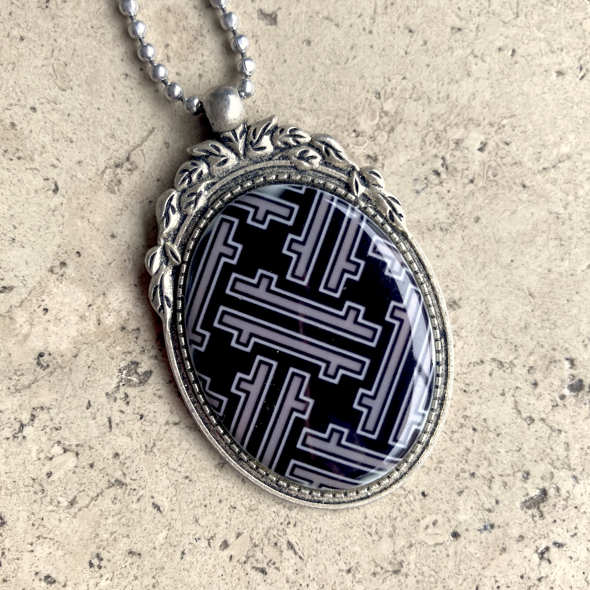 Bijou en métal orné d’un camée de 4 x 3 cm, imprimé artisanalement par mes soins.