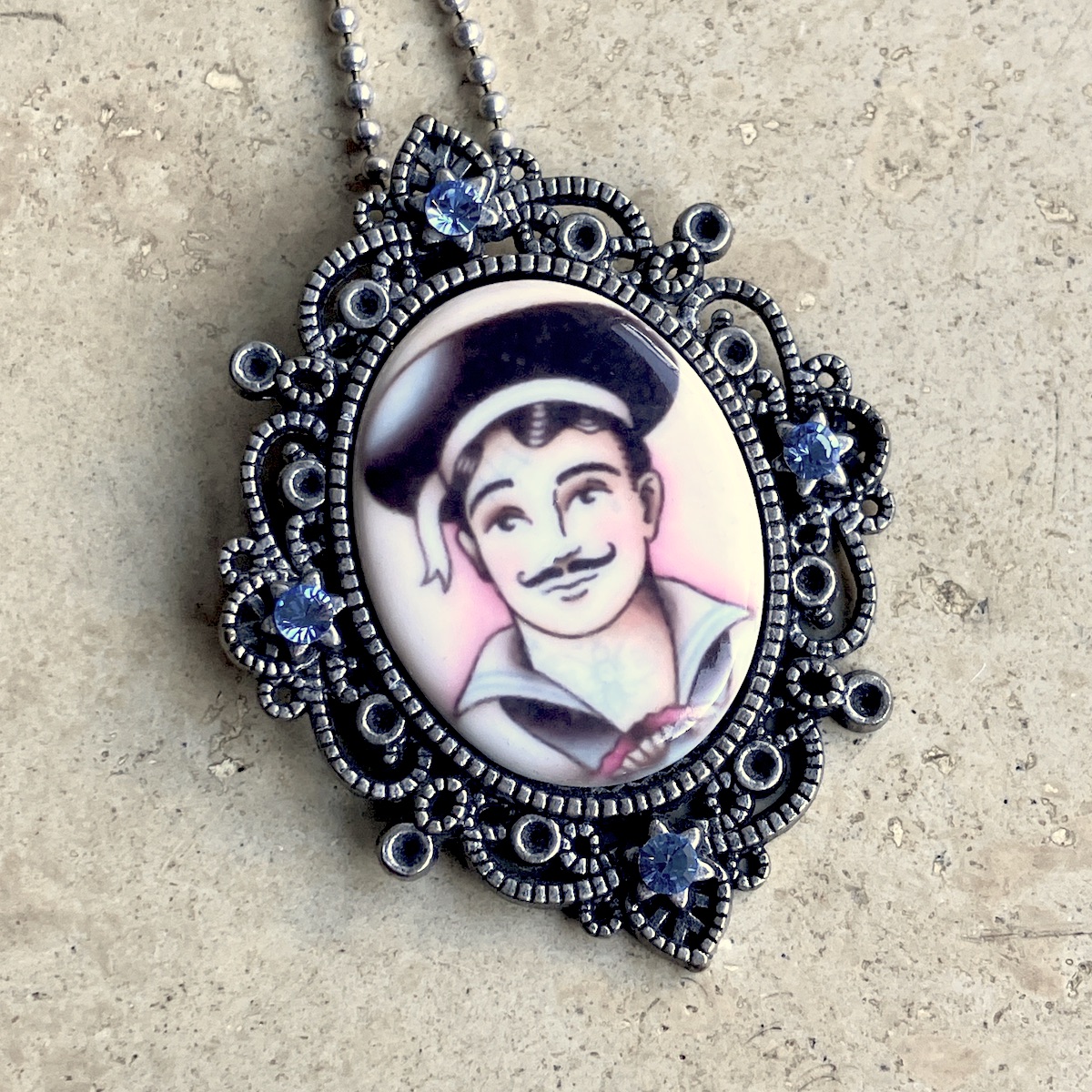 Bijou en métal orné d’un camée de 4 x 3 cm, imprimé artisanalement par mes soins.