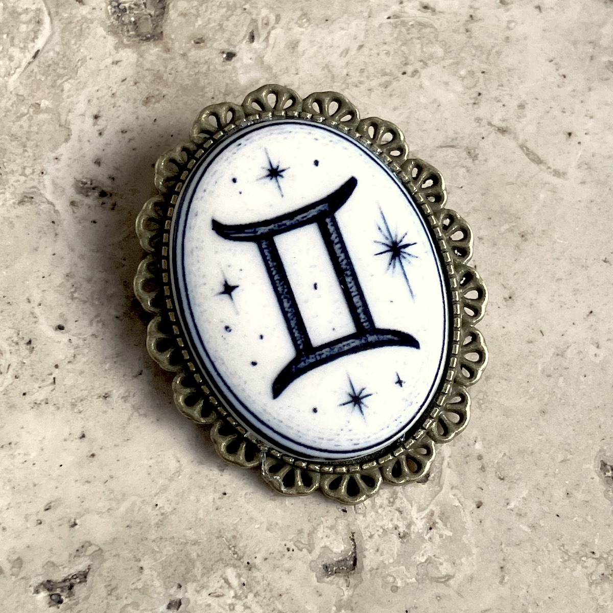 Broche en métal montée d’un camée en céramique (4cm*3cm) imprimée artisanalement par mes soins.