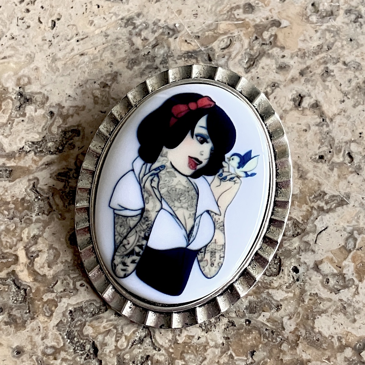 Broche en métal montée d’un camée en céramique (4cm*3cm) imprimée artisanalement par mes soins.