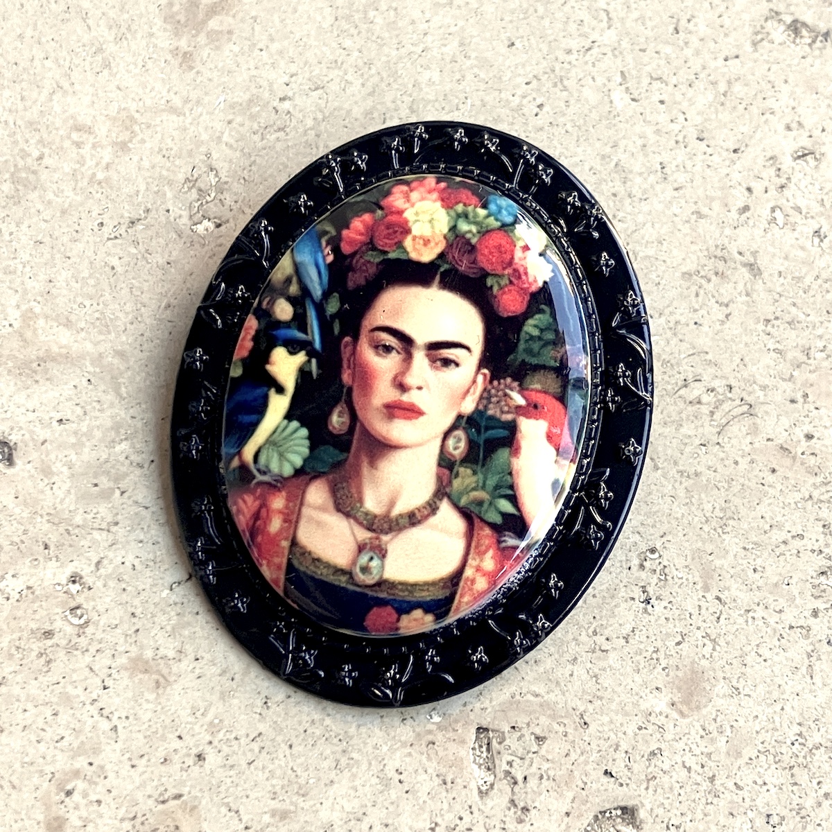 Broche en métal montée d’un camée en céramique (4cm*3cm) imprimée artisanalement par mes soins.