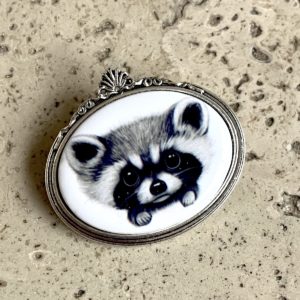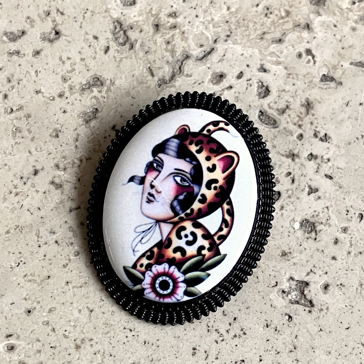 Broche en métal montée d’un camée en céramique (4cm*3cm) imprimée artisanalement par mes soins.