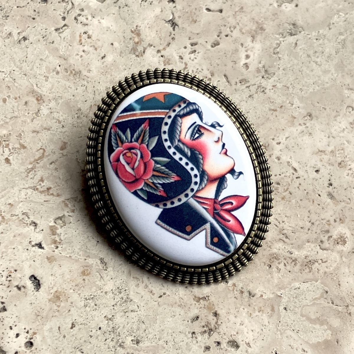 Broche en métal montée d’un camée en céramique (4cm*3cm) imprimée artisanalement par mes soins.