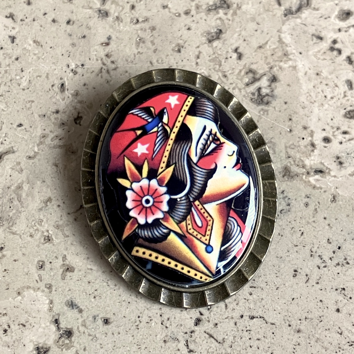 Broche en métal montée d’un camée en céramique (4cm*3cm) imprimée artisanalement par mes soins.