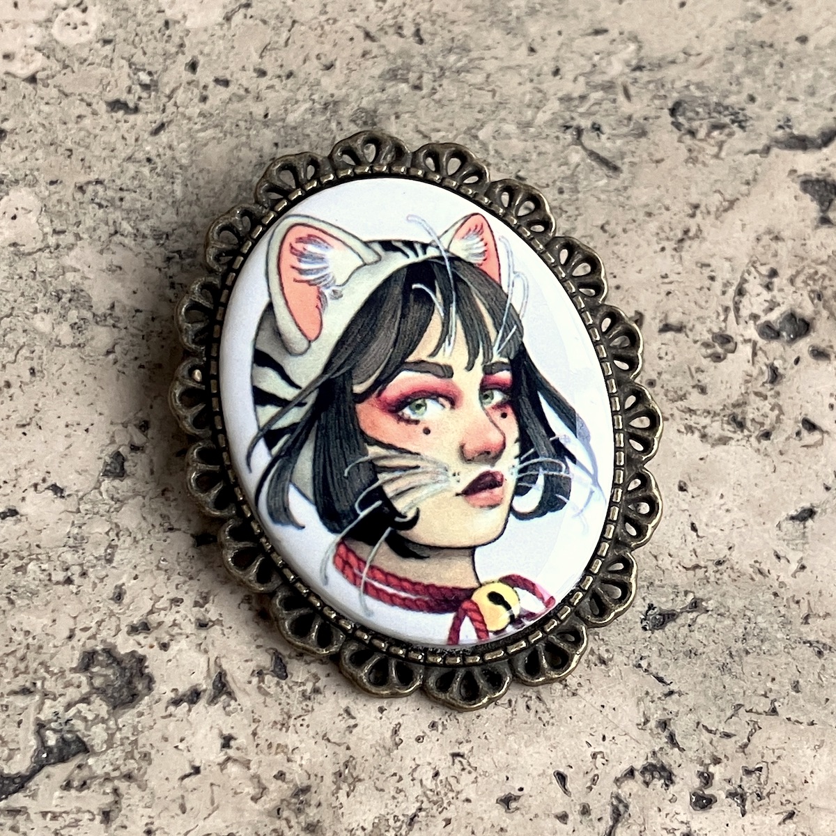 Broche en métal montée d’un camée en céramique (4cm*3cm) imprimée artisanalement par mes soins.