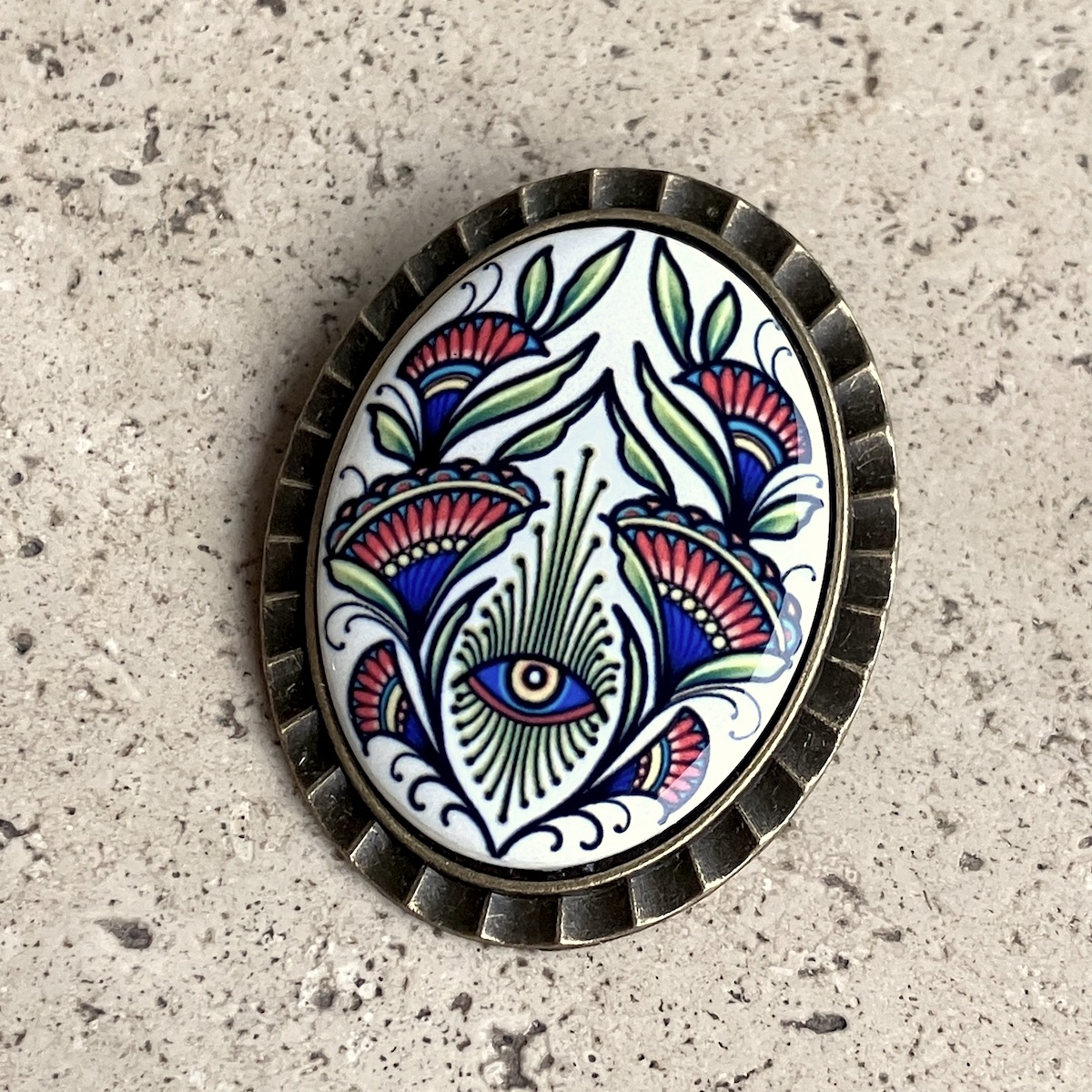 Broche en métal montée d’un camée en céramique (4cm*3cm) imprimée artisanalement par mes soins.