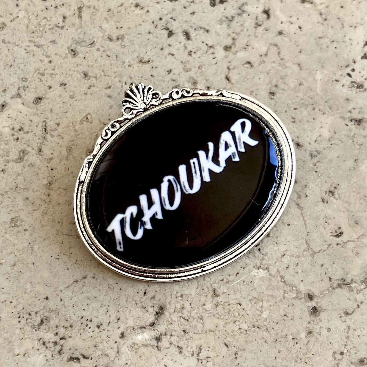Broche en métal montée d’un camée en céramique (4cm*3cm) imprimée artisanalement par mes soins. Illustration MESSAGE.