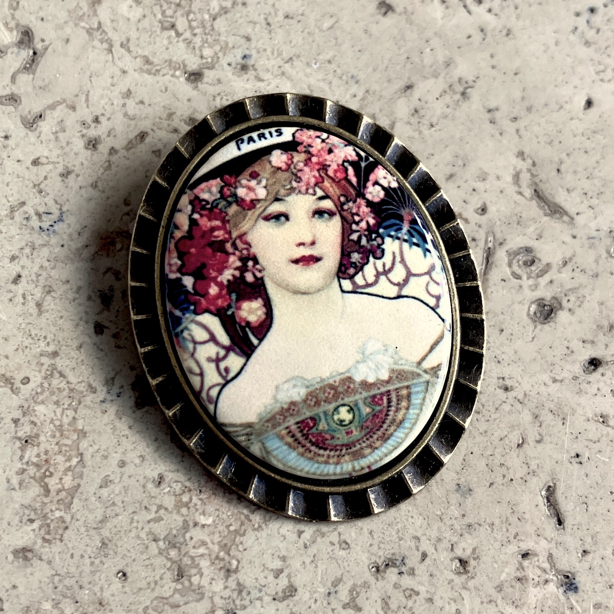 Broche en métal montée d’un camée en céramique (4cm*3cm) imprimée artisanalement par mes soins.