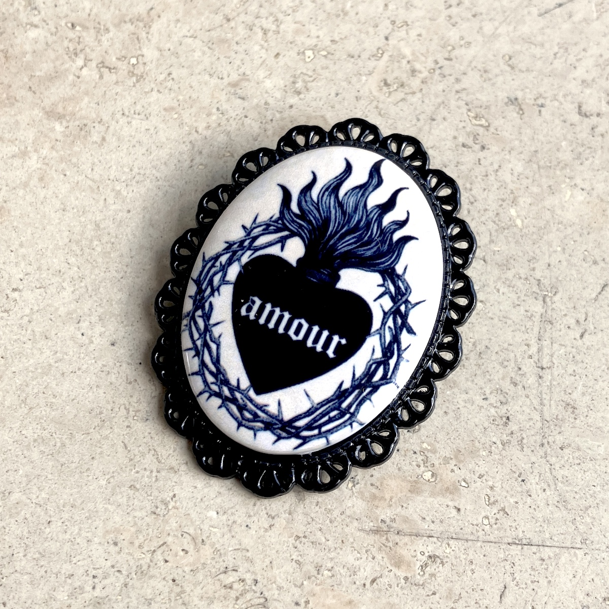 Broche en métal montée d’un camée en céramique (4cm*3cm) imprimée artisanalement par mes soins.
