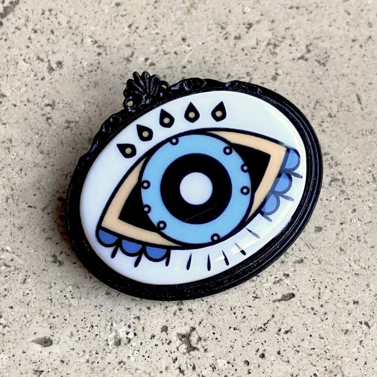 Broche en métal montée d’un camée en céramique (4cm*3cm) imprimée artisanalement par mes soins.