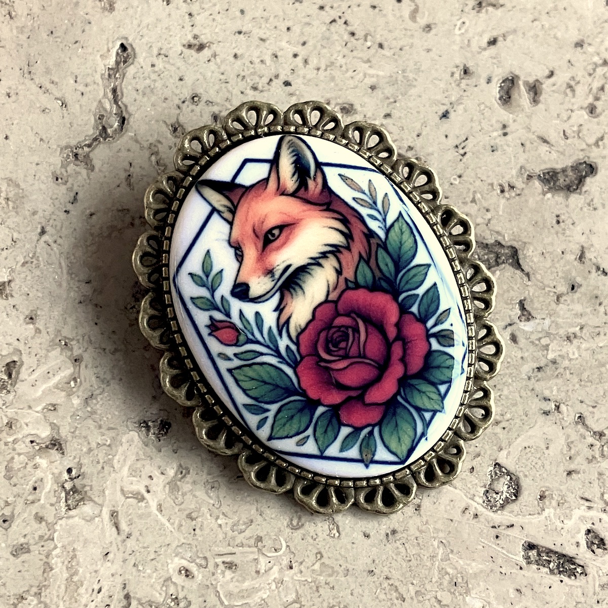 Broche en métal montée d’un camée en céramique (4cm*3cm) imprimée artisanalement par mes soins.