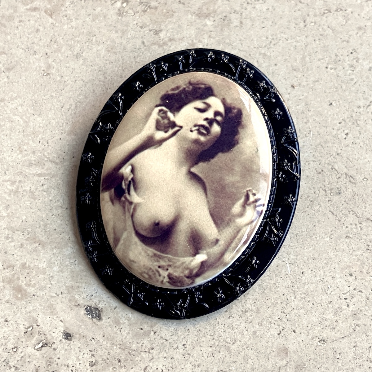Broche en métal montée d’un camée en céramique (4cm*3cm) imprimée artisanalement par mes soins.