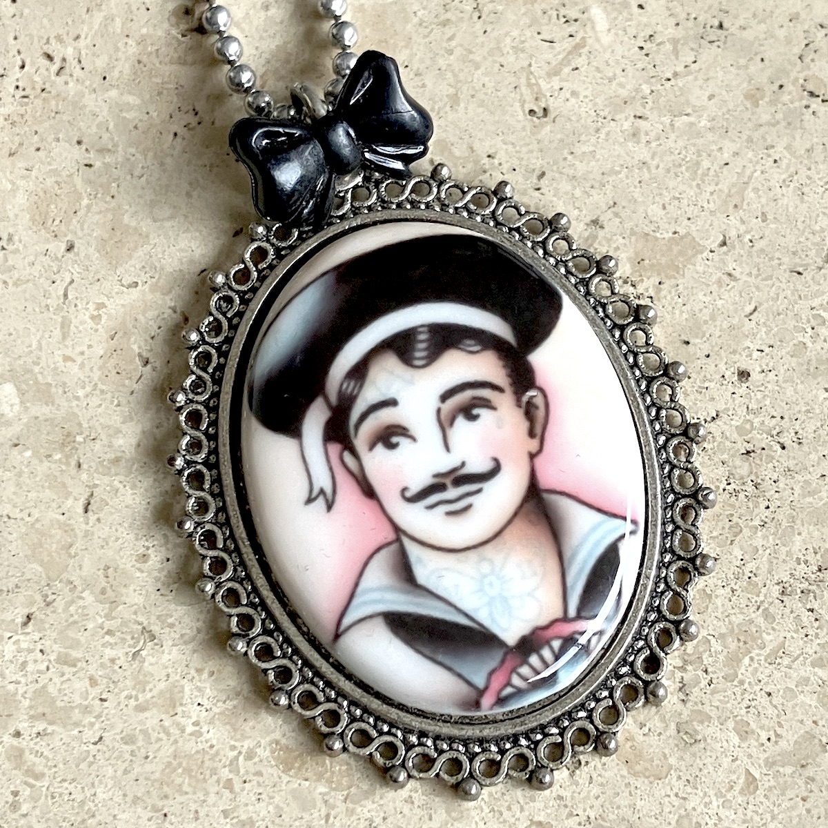 Pendentif en métal monté d’un camée en céramique (4cm*3cm) imprimée artisanalement par mes soins.