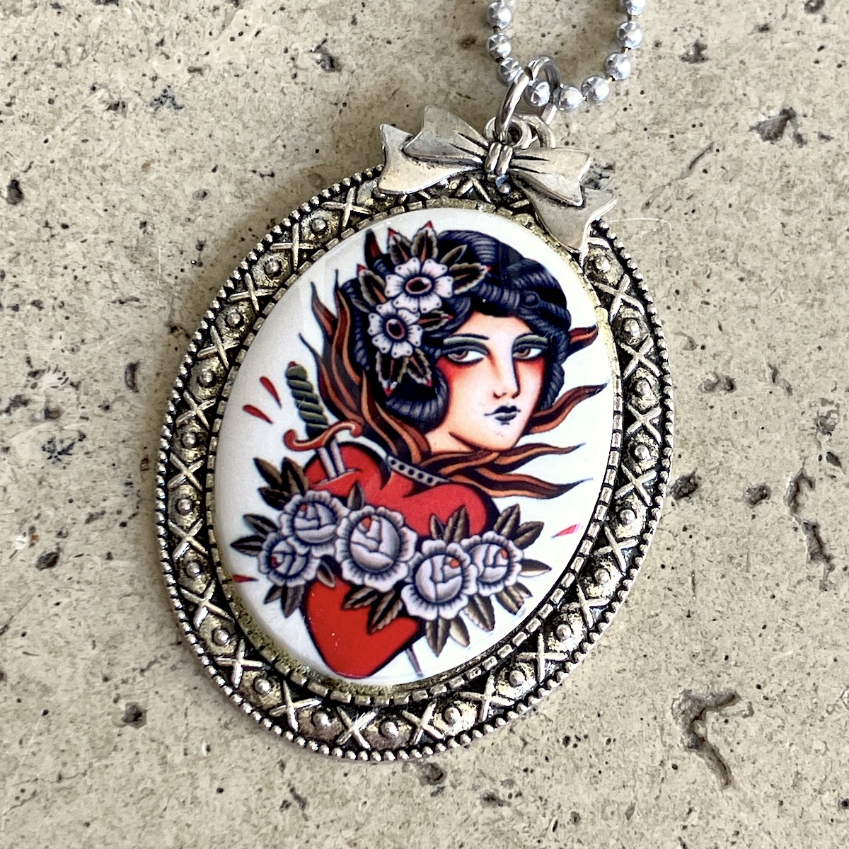 Pendentif en métal monté d’un camée en céramique (4cm*3cm) imprimée artisanalement par mes soins.