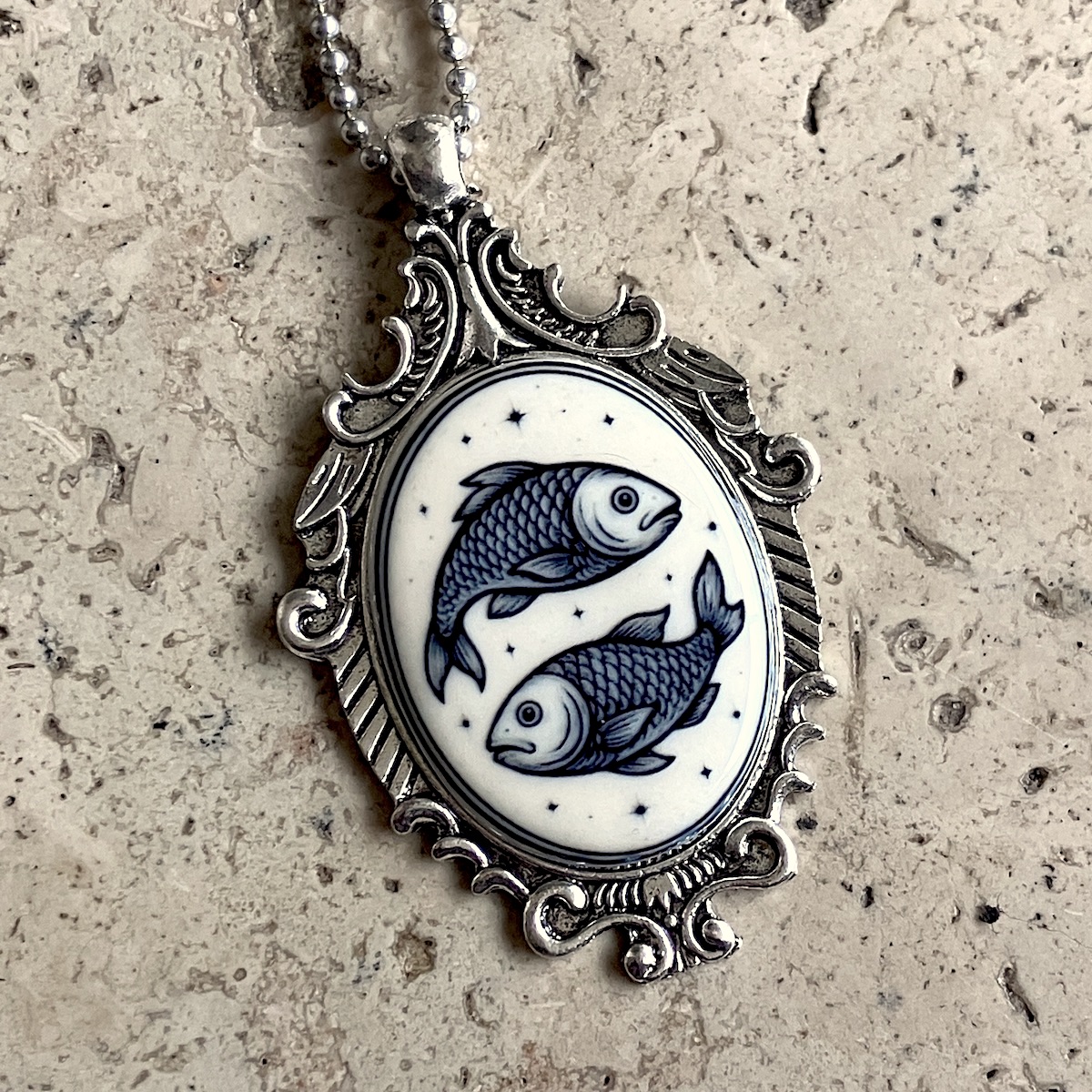Pendentif en métal monté d’un camée en céramique (4cm*3cm) imprimée artisanalement par mes soins.
