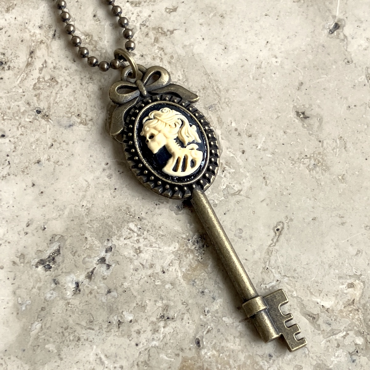 Pendentif clefen métal monté d’un camée en RÉSINE (13mm*18mm).
