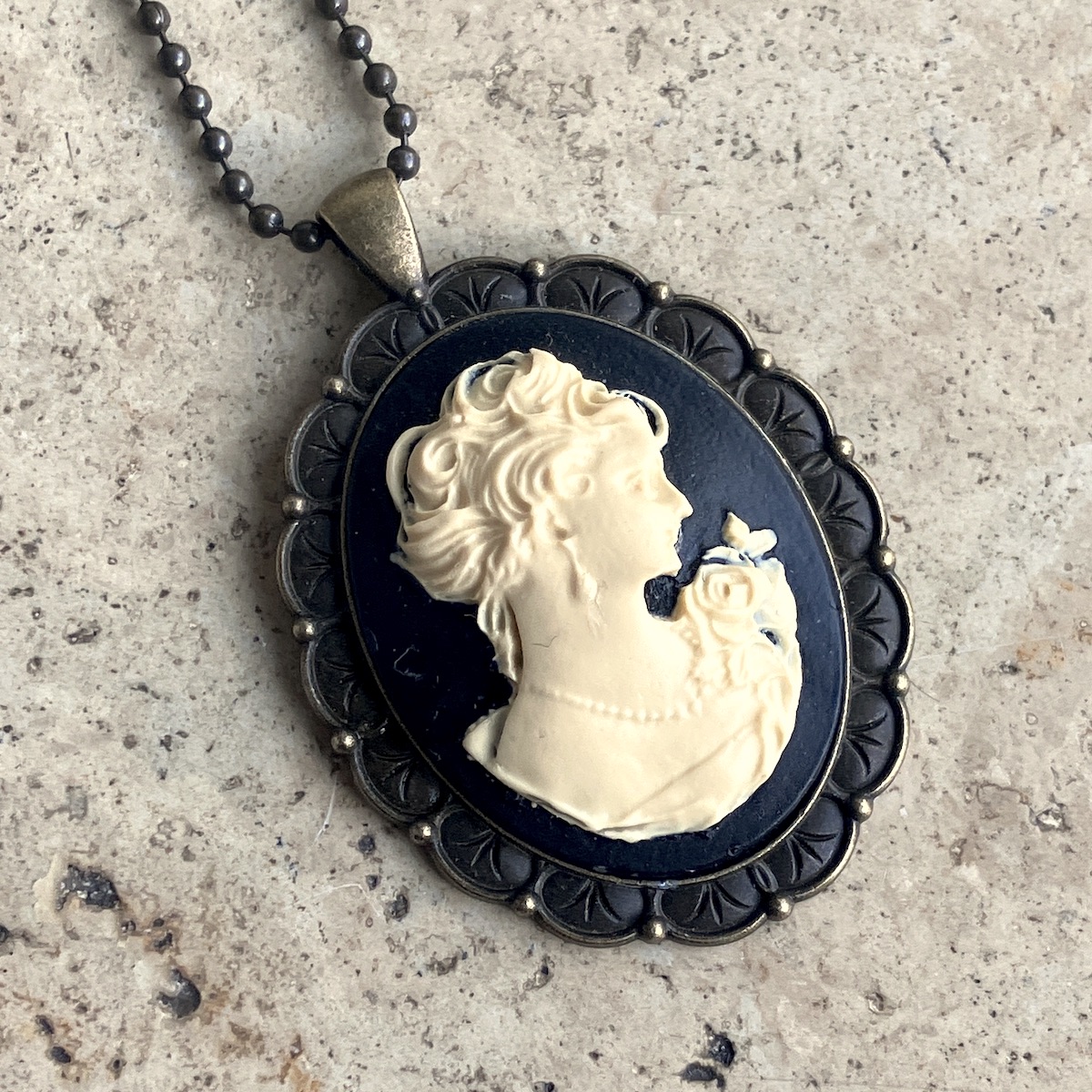 Pendentif en métal monté d’un camée en RÉSINE (4cm*3cm).