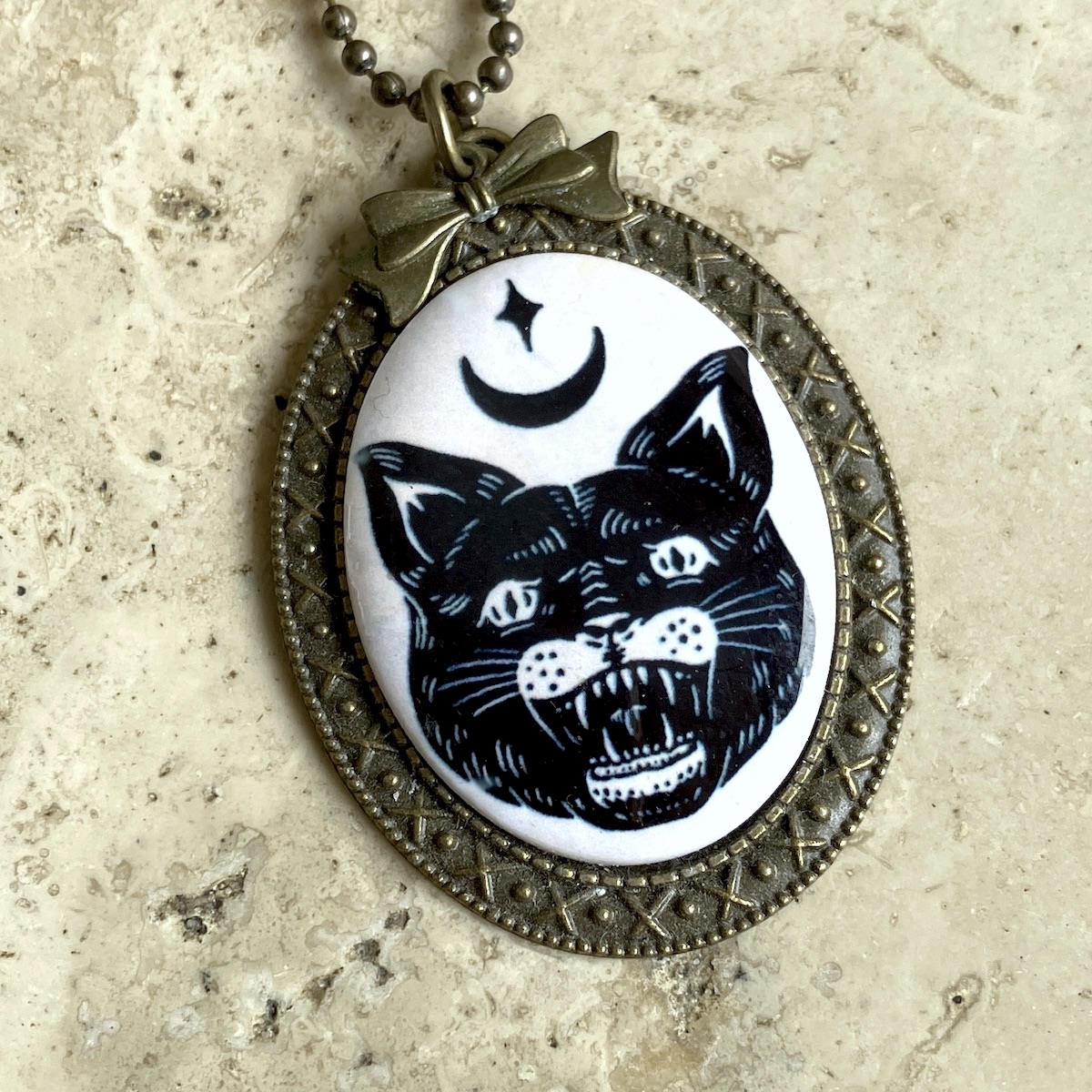 Pendentif en métal monté d’un camée en céramique (4cm*3cm) imprimée artisanalement par mes soins.