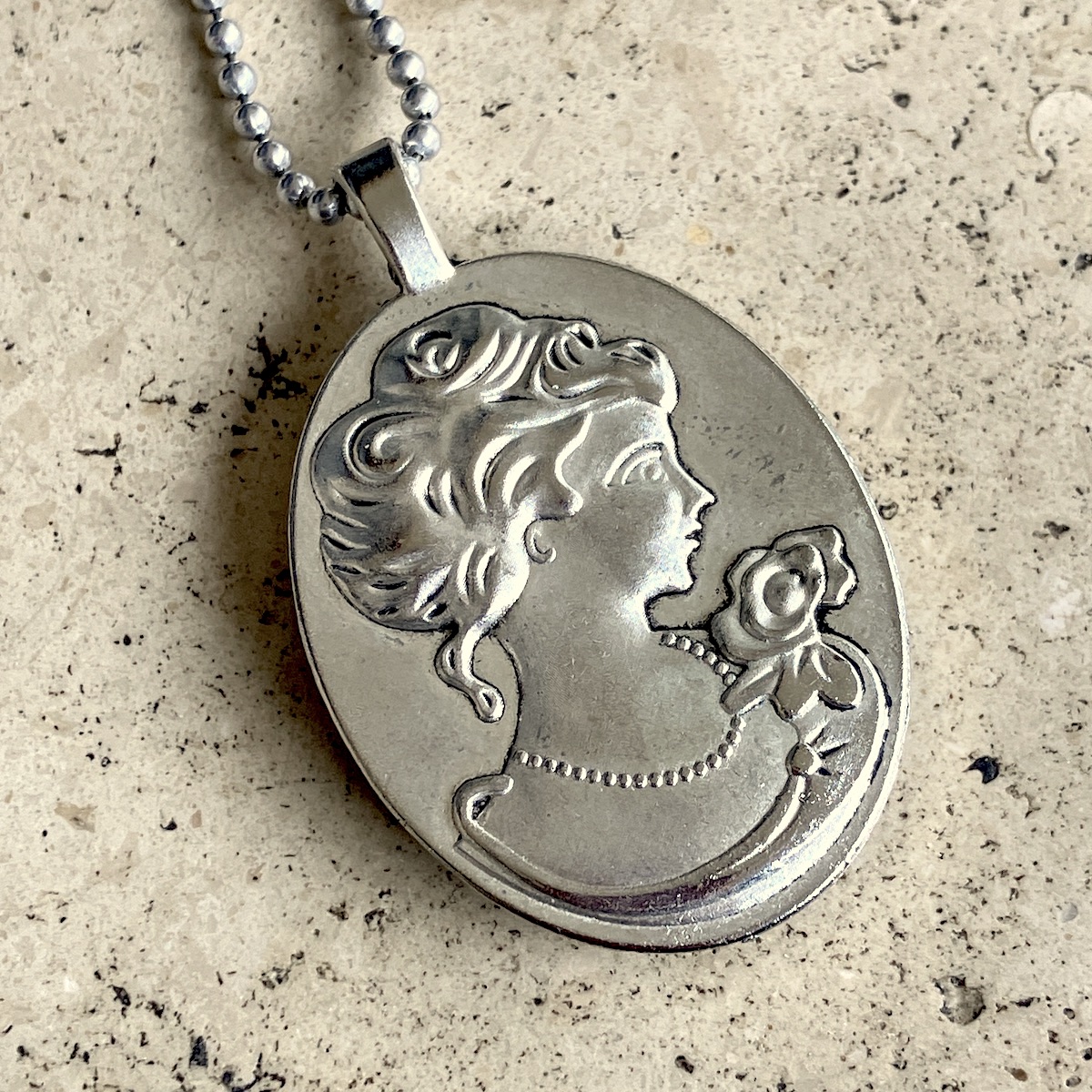 Pendentif en métal monté d’un camée en céramique (4cm*3cm) imprimée artisanalement par mes soins.
