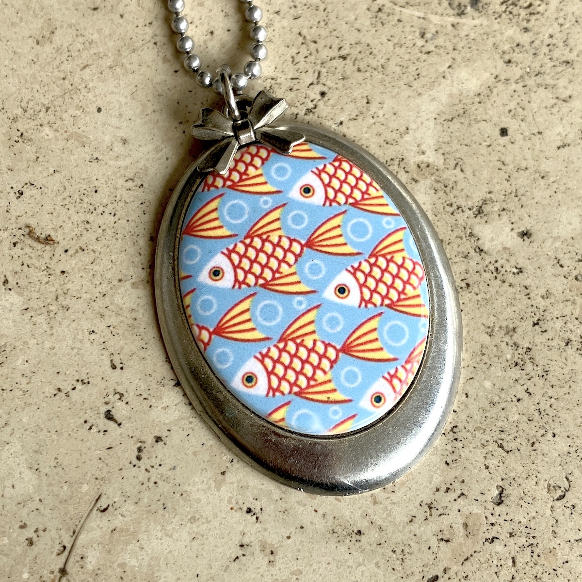 Pendentif en métal monté d’un camée en céramique (4cm*3cm) imprimée artisanalement par mes soins.