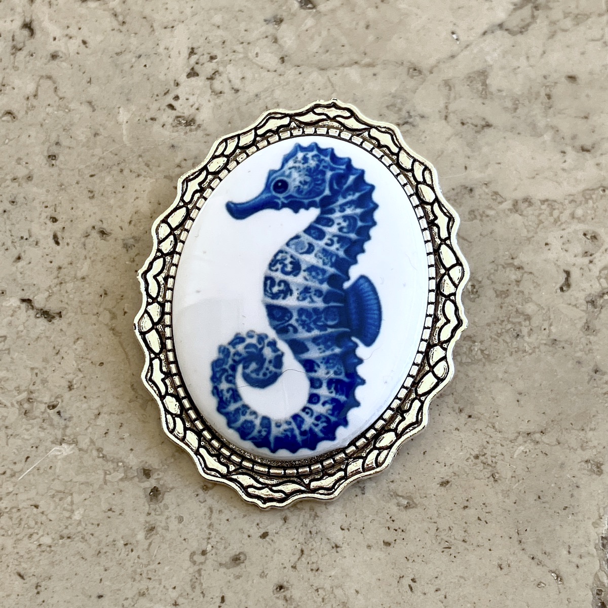 Broche en métal montée d’un camée en céramique (4cm*3cm) imprimée artisanalement par mes soins.