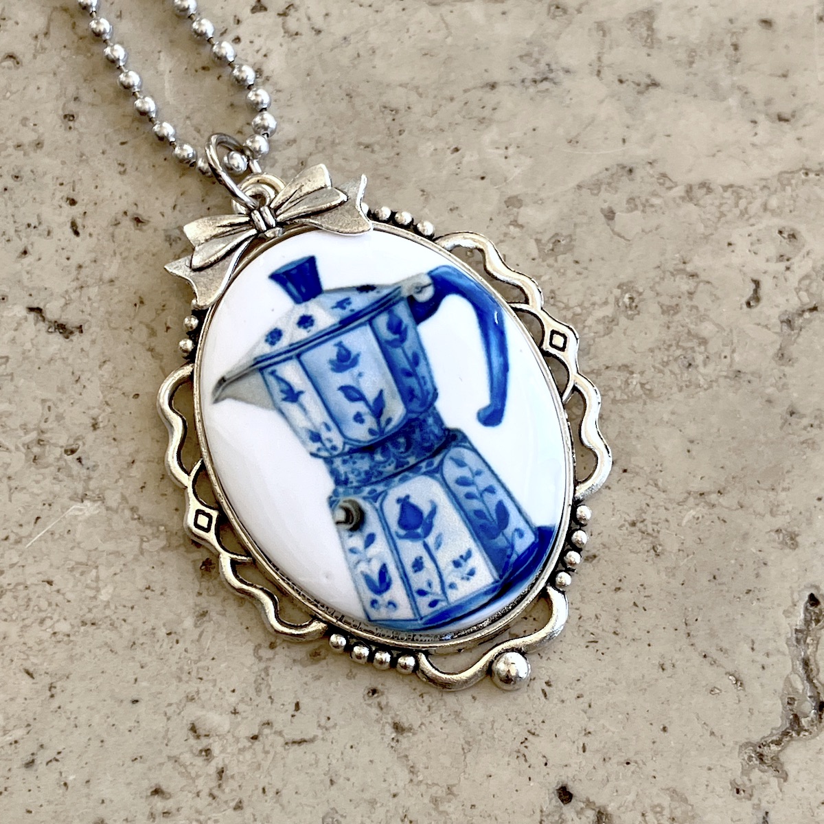 Pendentif en métal monté d’un camée en céramique (4cm*3cm) imprimée artisanalement par mes soins.
