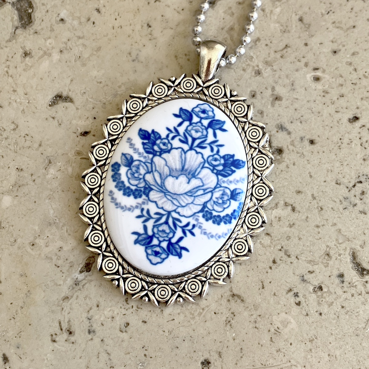 Pendentif en métal monté d’un camée en céramique (4cm*3cm) imprimée artisanalement par mes soins.