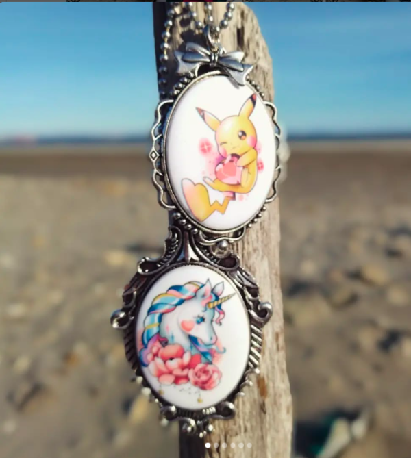 Collier chainette à boules, avec pendentif en métal monté d’un camée en céramique imprimée artisanalement