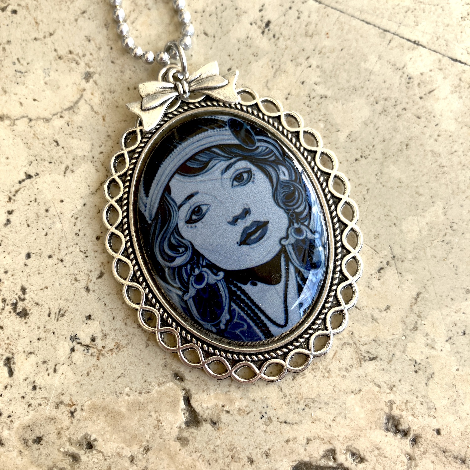 Pendentif en métal monté d’un camée en céramique imprimée artisanalement par mes soins.