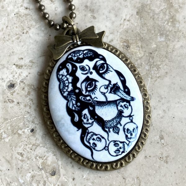 Pendentif en métal monté d’un camée en céramique (4cm*3cm) imprimée artisanalement par mes soins.