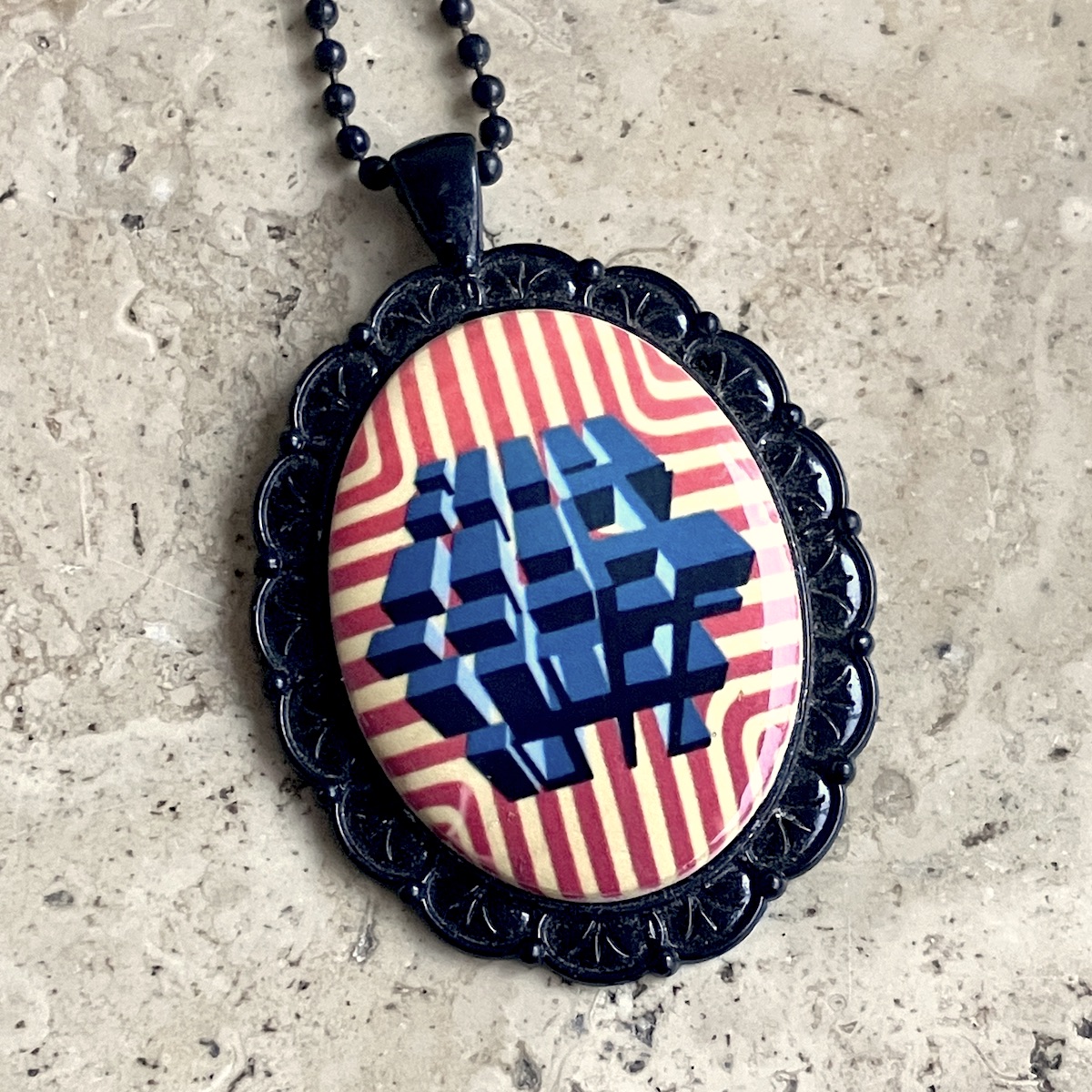 Pendentif en métal monté d’un camée en céramique (4cm*3cm) imprimée artisanalement par mes soins.