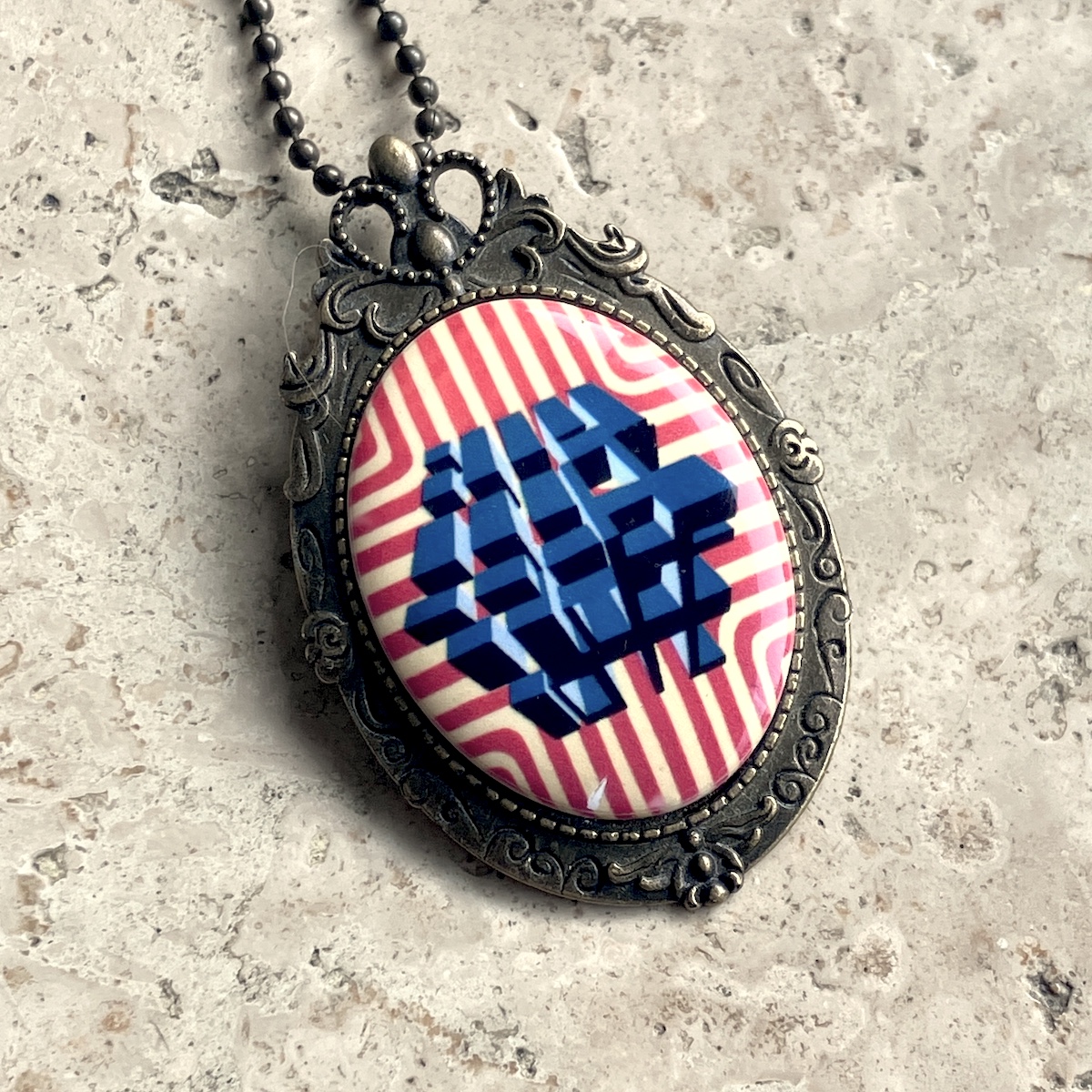 Pendentif en métal monté d’un camée en céramique (4cm*3cm) imprimée artisanalement par mes soins.