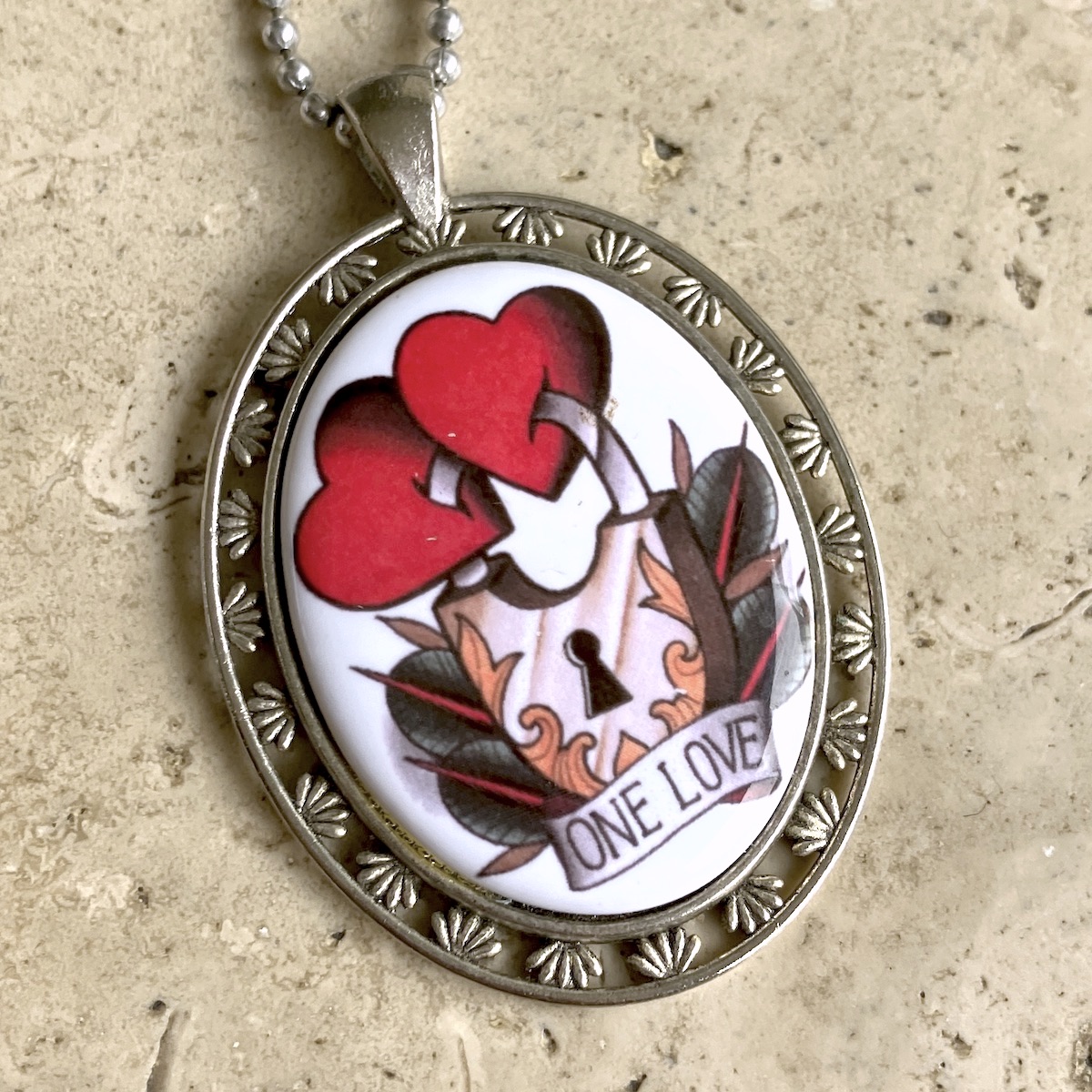Pendentif en métal monté d’un camée en céramique (4cm*3cm) imprimée artisanalement par mes soins.