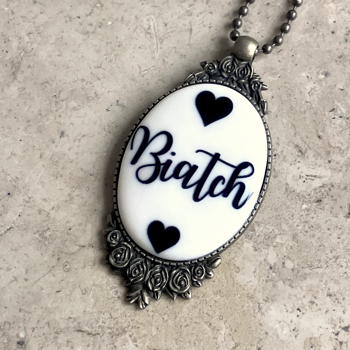 Pendentif en métal monté d’un camée en céramique imprimée artisanalement par mes soins.
