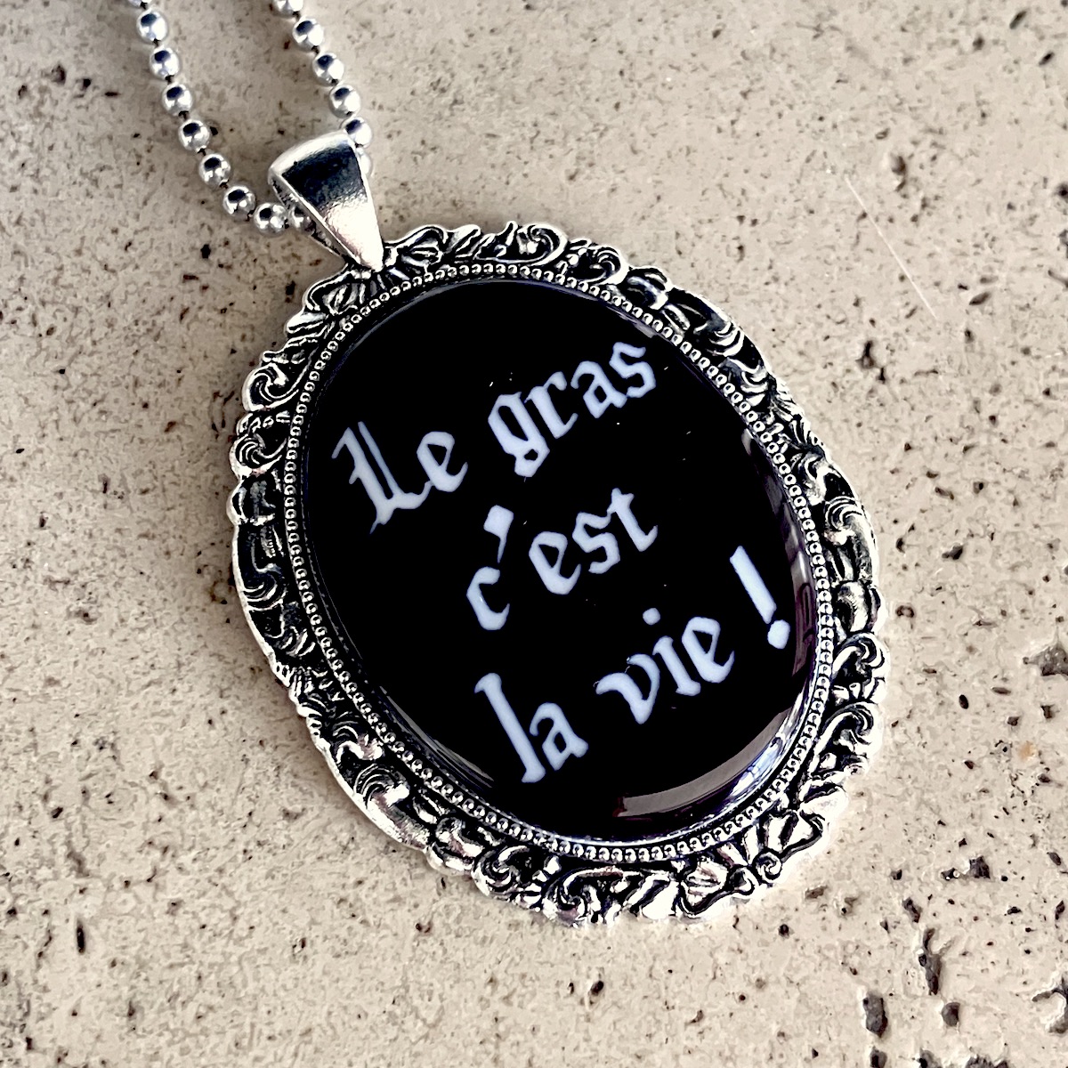 Pendentif en métal monté d’un camée en céramique imprimée artisanalement par mes soins.