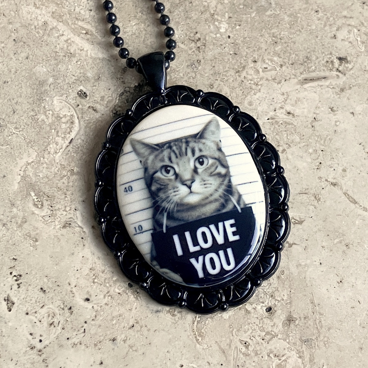 Pendentif en métal monté d’un camée en céramique imprimée artisanalement par mes soins.