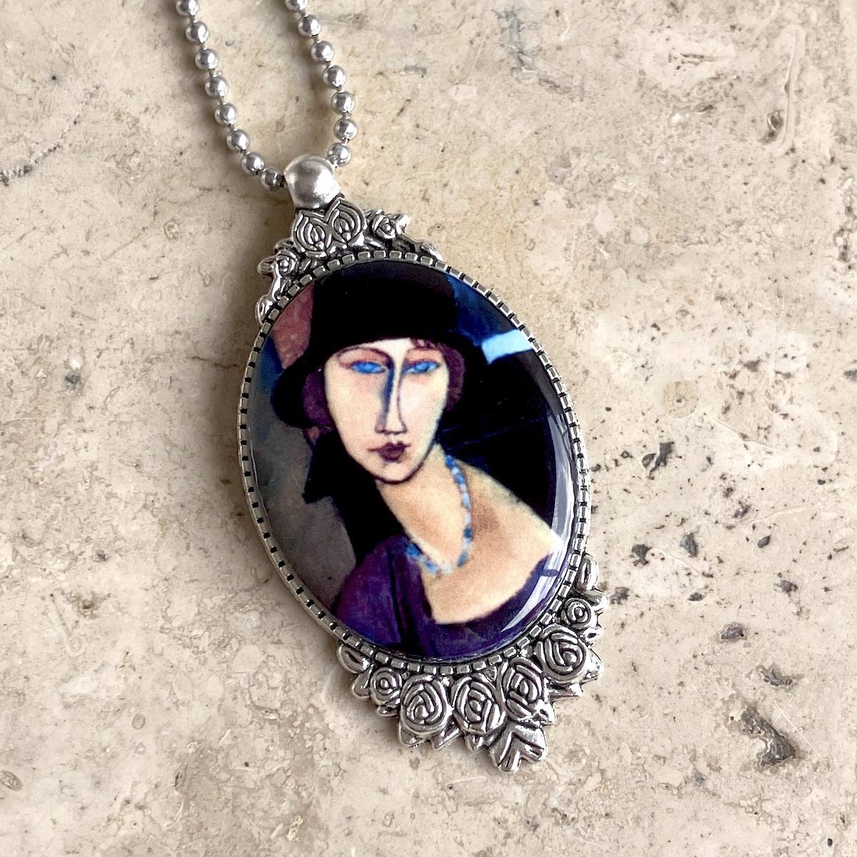 Pendentif en métal monté d’un camée en céramique (4cm*3cm) imprimée artisanalement par mes soins.