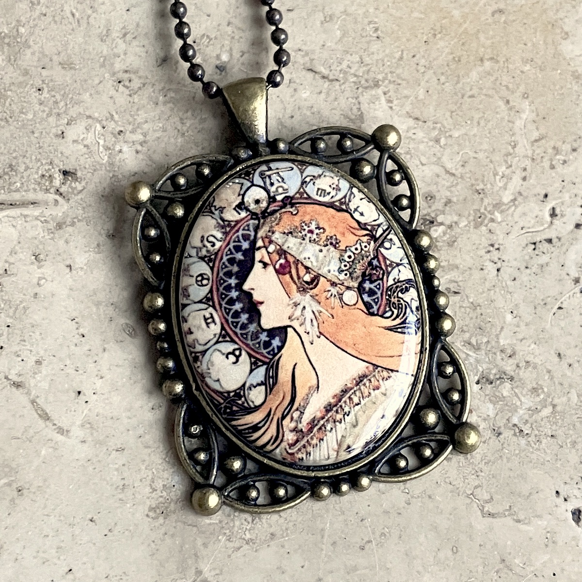 Pendentif en métal monté d’un camée en céramique (4cm*3cm) imprimée artisanalement par mes soins.