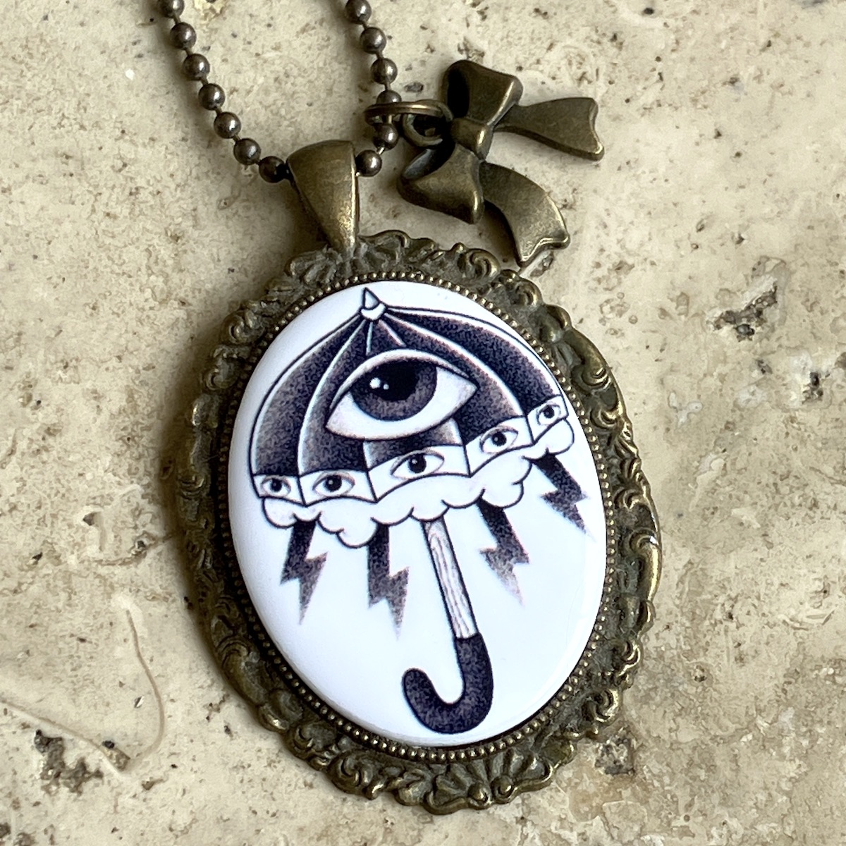 Pendentif en métal monté d’un camée en céramique (4cm*3cm) imprimée artisanalement par mes soins.