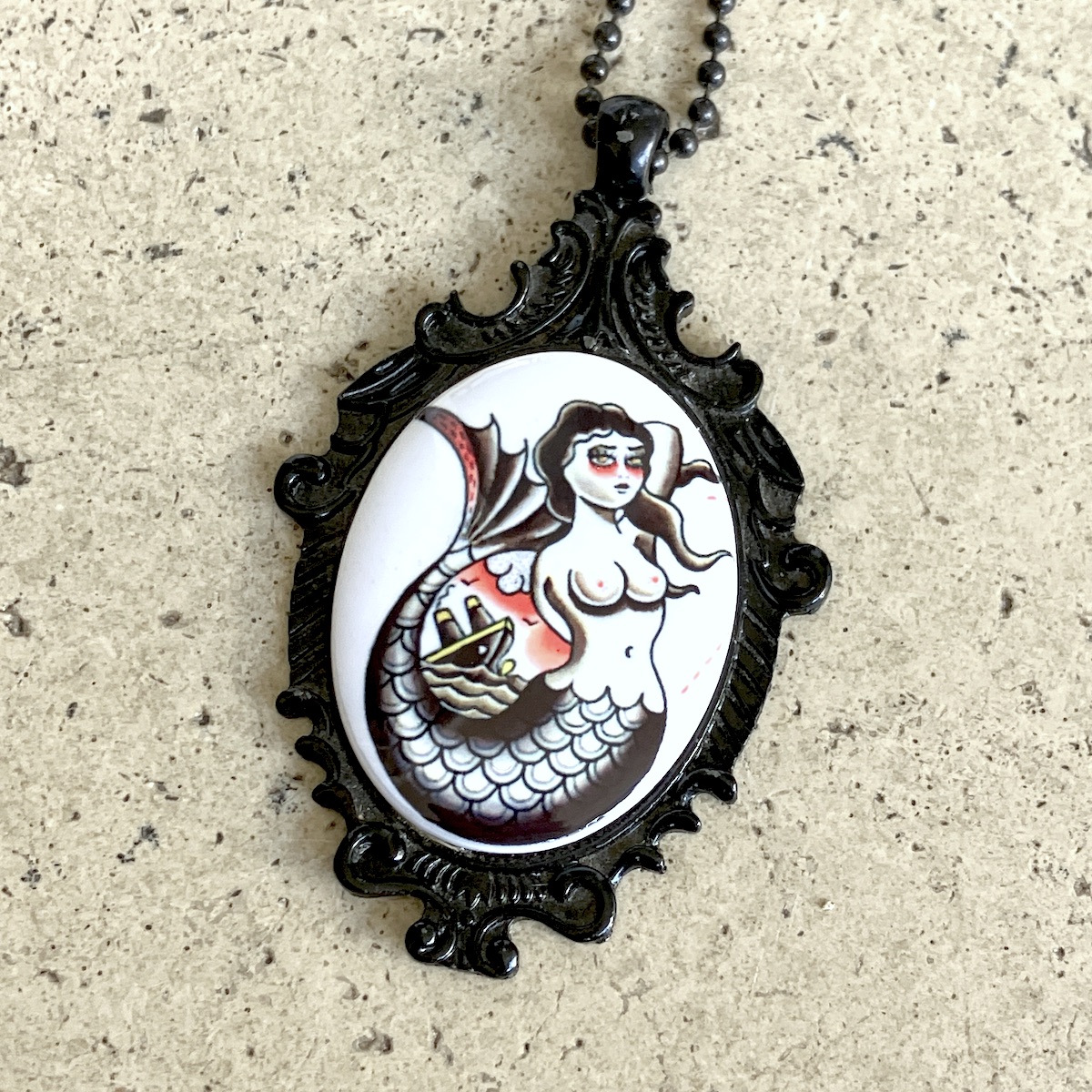 Pendentif en métal monté d’un camée en céramique (4cm*3cm) imprimée artisanalement par mes soins.