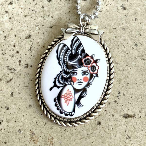 Pendentif en métal monté d’un camée en céramique (4cm*3cm) imprimée artisanalement par mes soins.