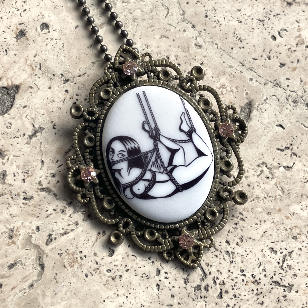 Pendentif en métal monté d’un camée en céramique (4cm*3cm) imprimée artisanalement par mes soins.