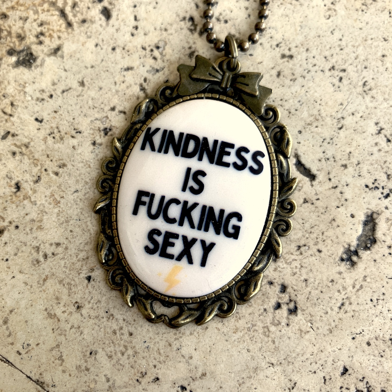 Pendentif en métal monté d’un camée en céramique (4cm*3cm) imprimée artisanalement par mes soins.