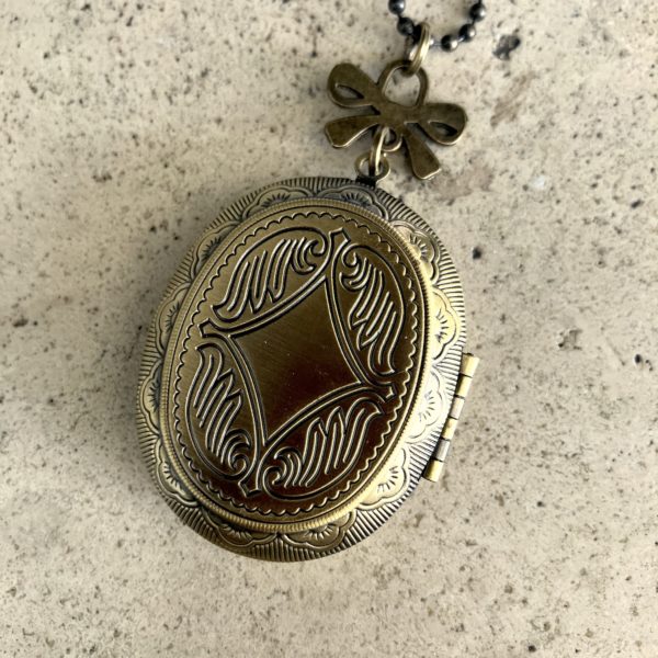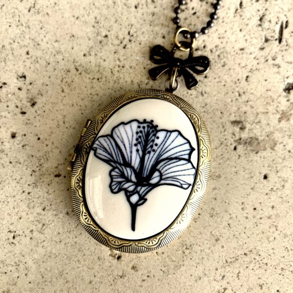 Pendentif qui s’ouvre (pilulier) en métal, monté d’un camée en céramique (4cm*3cm) imprimée artisanalement par mes soins.