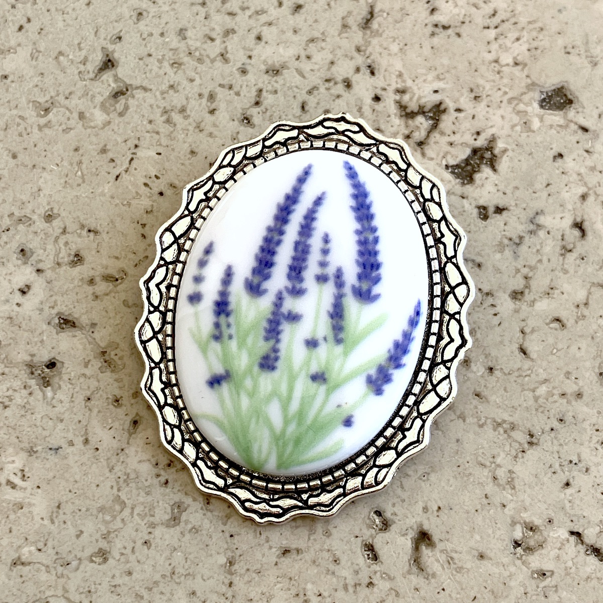Broche en métal montée d’un camée en céramique (4cm*3cm) imprimée artisanalement par mes soins.