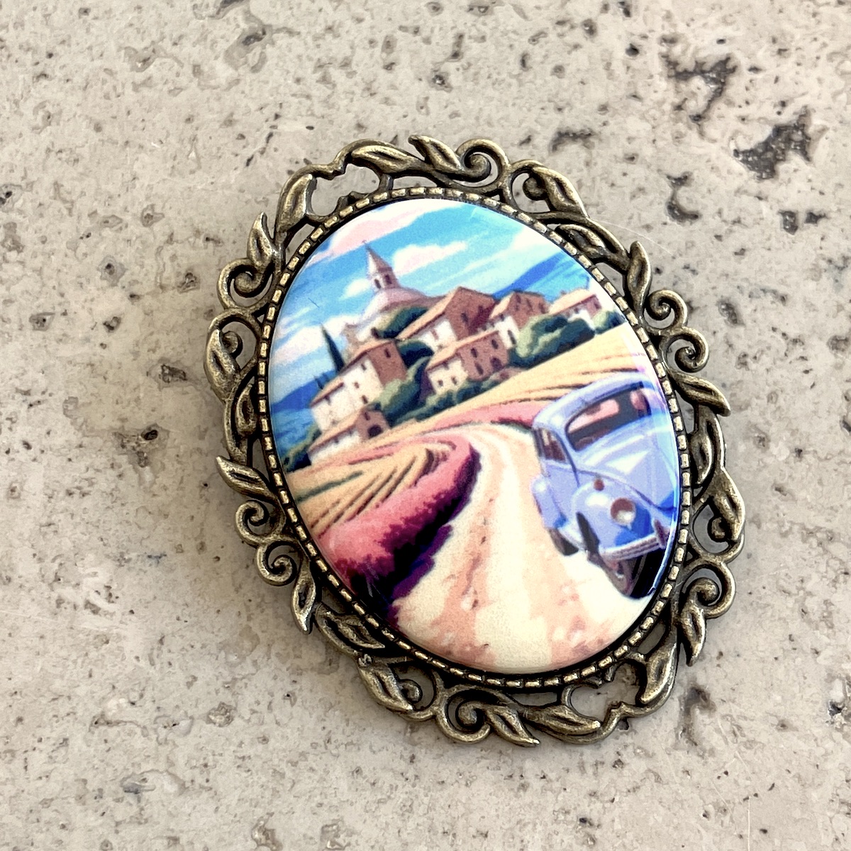 Broche en métal montée d’un camée en céramique (4cm*3cm) imprimée artisanalement par mes soins.