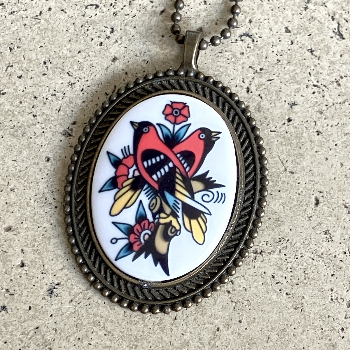 Pendentif en métal monté d’un camée en céramique (4cm*3cm) imprimée artisanalement par mes soins.